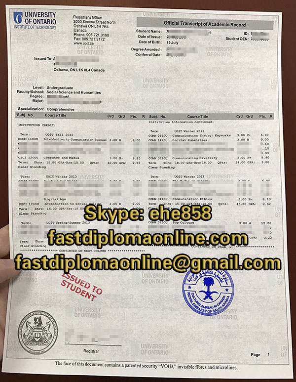 The real copy of University of Ontario Institute of Technology(UOIT) official transcript. University of Ontario Institute of Technology official transcript, can we buy fake UOIT transcripts for getting a job? The Ontario Institute of Technology was established in 2002. Originally known as Deheng College, it is a government public university. It is a leading university in Canada with advanced teaching equipment and strong teaching staff. The campus covers an area of ​​more than 1.6 million square meters, with complete planning, advanced facilities and a strong artistic atmosphere. With its own strong teaching strength and faculty honor, the school has established long-term cooperation with many well-known large companies such as GM, Ford, IBM, Microsoft, etc. It is called MIT in Canada and is the first in Ontario in Canada. Public college.